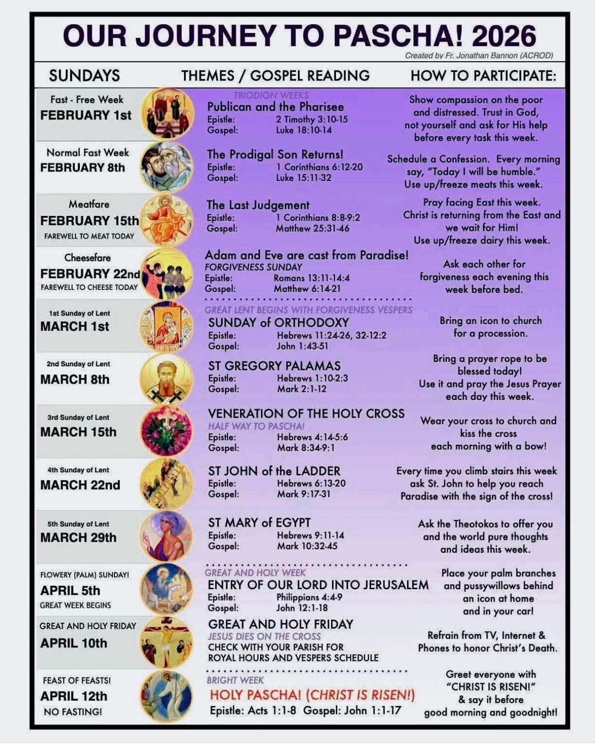 Four weeks of Preparation for the Journey leading up to the Beginning of Great Lent on Clean Monday, February 23